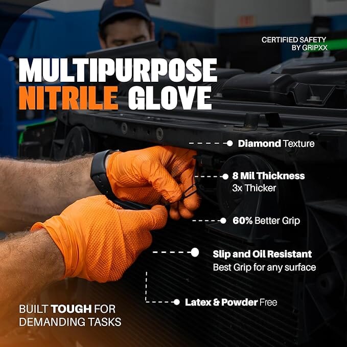 GRIPXX 8 Mil Orange Nitrile Gloves–Heavy Duty, 3D Raised Diamond Texture Grip–Industrial Mechanic, Food Grade–Disposable